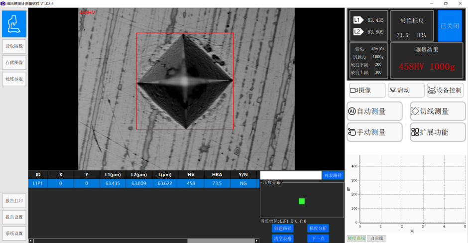 软件右上方可显示当前测试硬度值结果,合格时为绿色,否则为红色。同时 可显示硬度转换值、压痕的长宽值、当前镜头、试验力、硬度合格范围等信息。