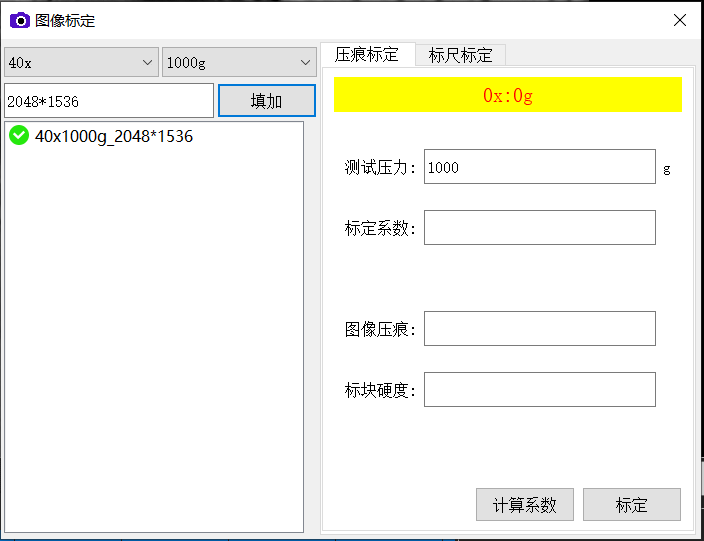 在左侧系数列表中选择当前镜头倍率和压力值,在右侧压痕标定页面输入标 块硬度,点击“计算系数 ”,此时将自动在界面填入标定系数,计算没问题时点 击“标定按钮 ”完成当前系数标定。