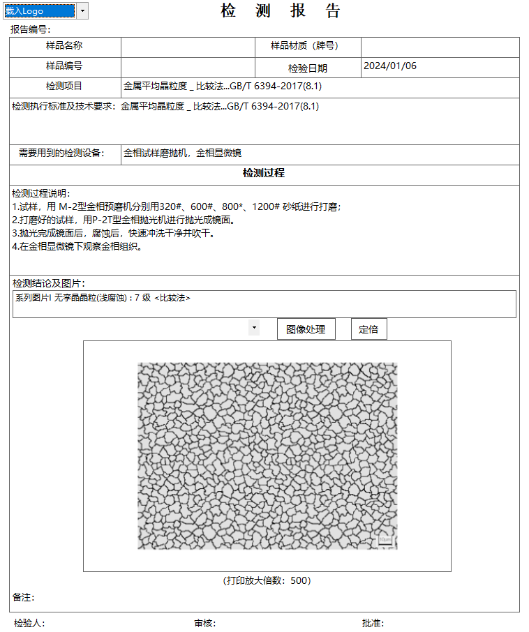 l 多样化报告模板:自动生成图文并茂的金相组织分析报告,可选择生成单模块或多模块报告样式。报告模板可修改添加企业logo、公司名、检测过程等内容。可根据需求定制专属报告模板。
