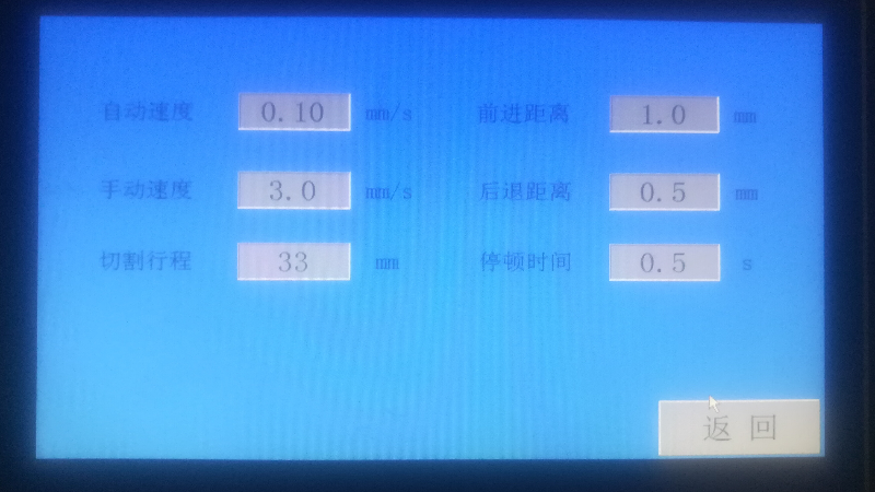 (3)手动速度:手动模式下,按动上下箭头键,切片每秒前进后退速度,包括自动停止时退回原点的速度。