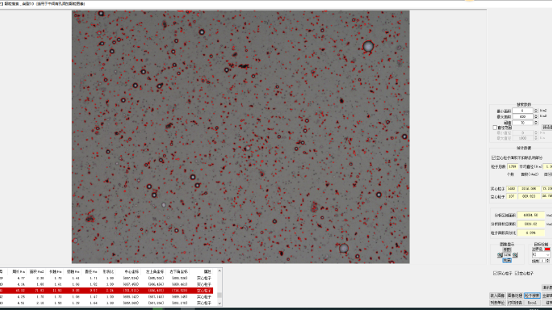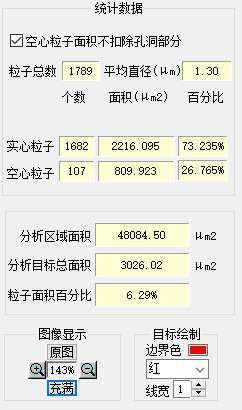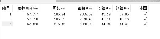 长轴、短轴、直径、形状比、坐标、属性(实心粒子、空心粒子),统计出颗粒总数、平均直径、实心和空心粒子的面积以及颗粒总面积、颗粒面积百分比。