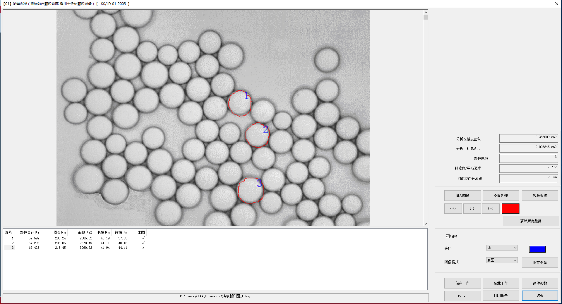 通过鼠标画线的方式,圈出颗粒轮廓,算出每个颗粒的颗粒直径、周长、面积、长轴、短轴,以及分析目标总面积、颗粒总数、颗粒数/平方毫米、相面积百分含量;可把目前的绘制工作保存为一个文件,该文件也可载入到软件中: