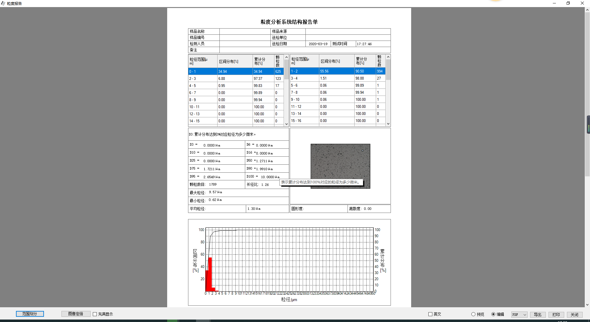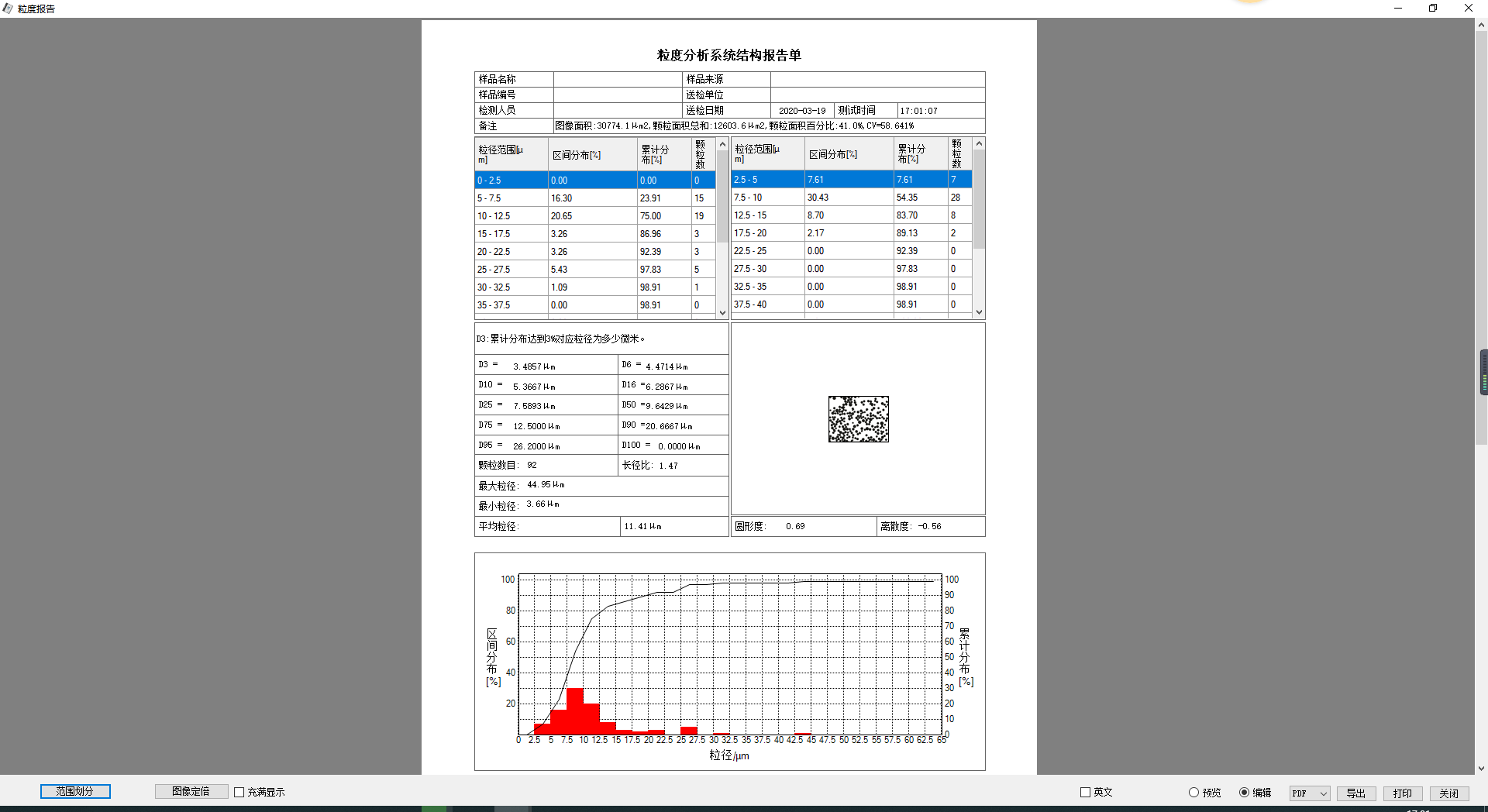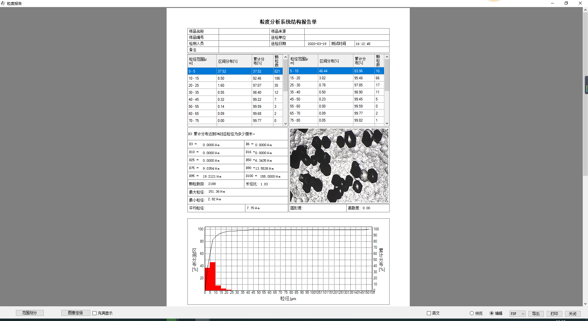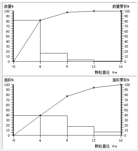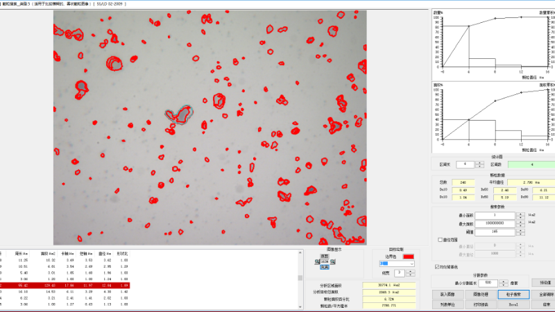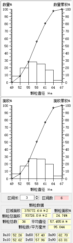 长轴、短轴、直径,以及颗粒总面积、颗粒面积百分比、颗粒总数、平均直径、颗粒数/平方毫米、DN10、DN50、DN90以及DS10、DS50、DS90等参数;统计颗粒直径区间的颗粒数、分布百分数、累积百分数,绘制统计图。