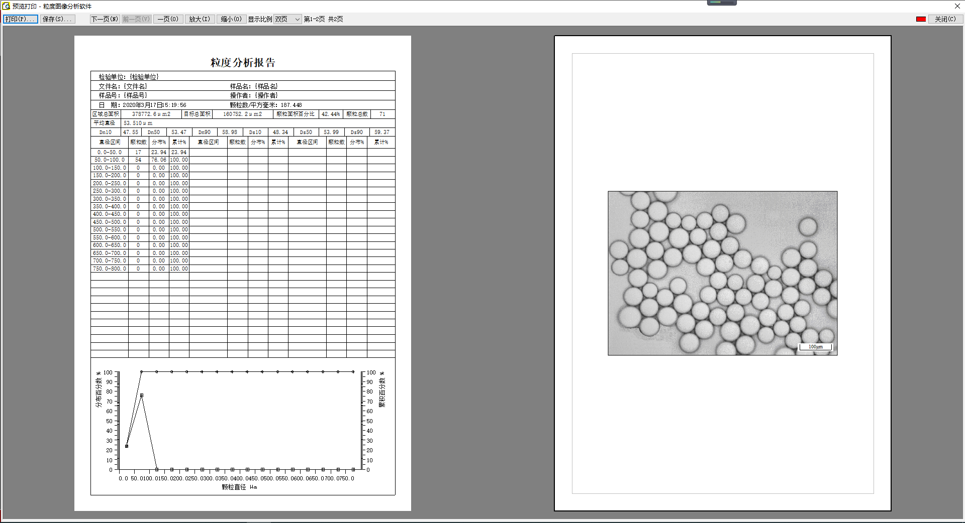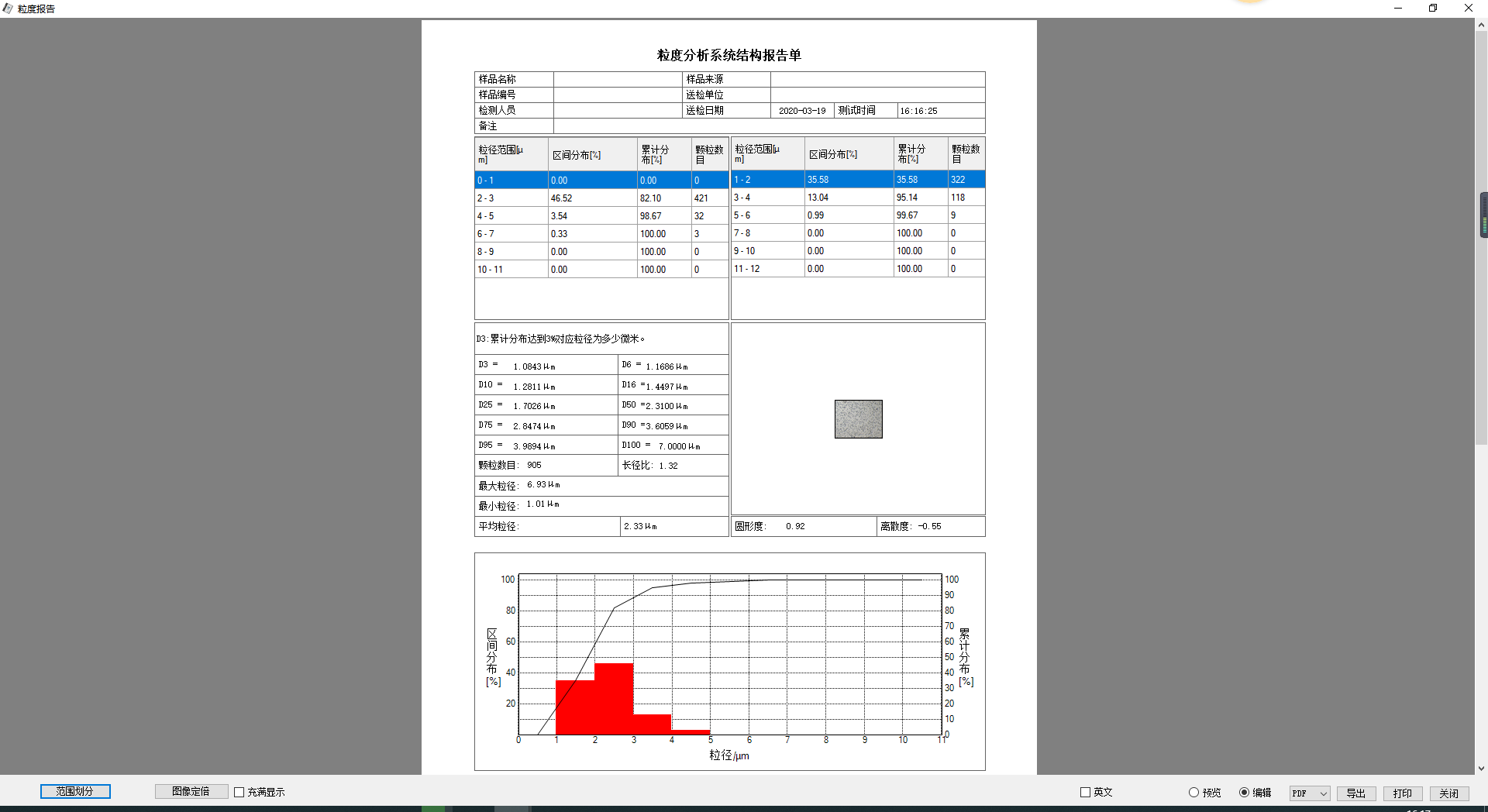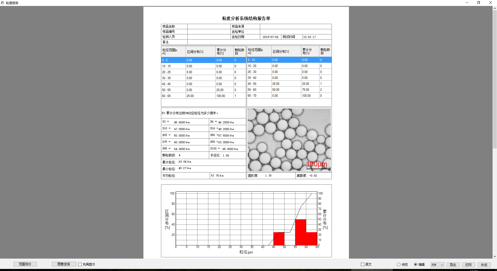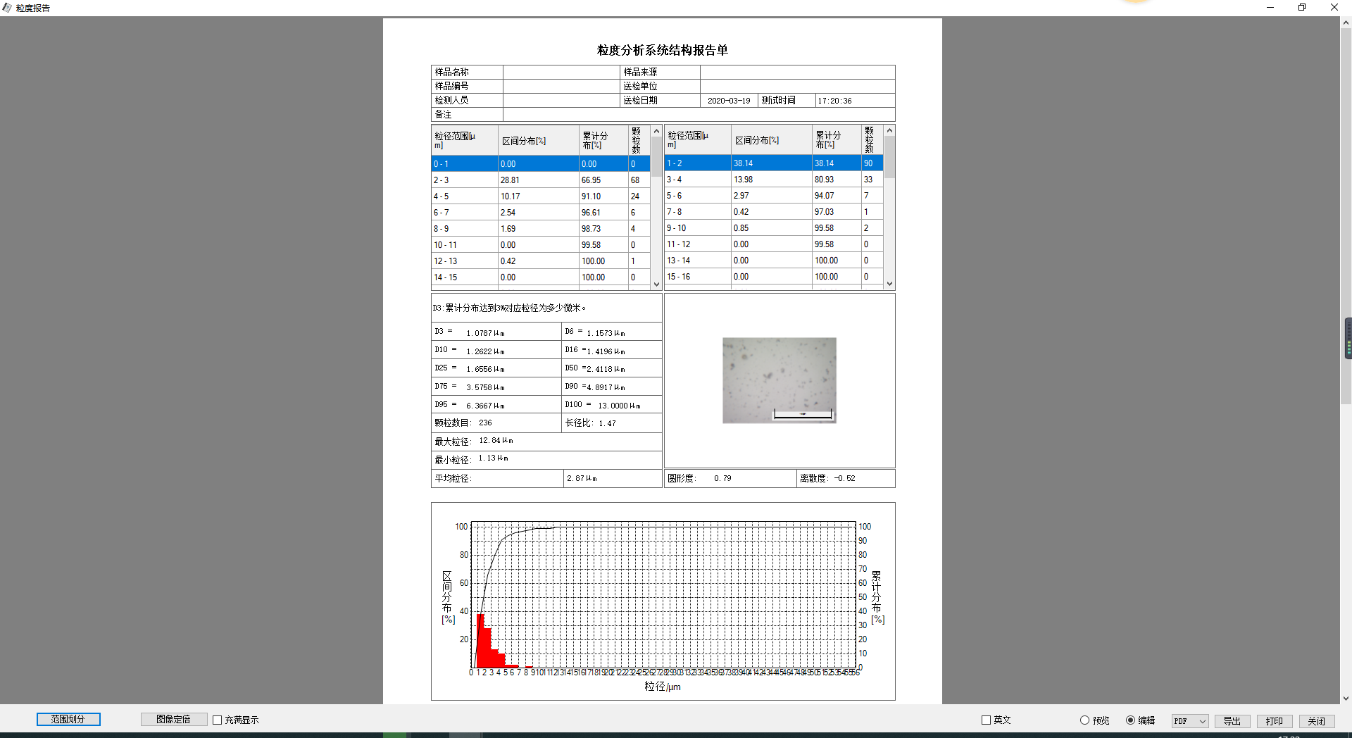 长轴、短轴、直径,以及颗粒总面积、颗粒面积百分比、颗粒总数、平均直径、颗粒数/平方毫米、DN10、DN50、DN90以及DS10、DS50、DS90等参数;统计颗粒直径区间的颗粒数、分布百分数、累积百分数,绘制统计图。