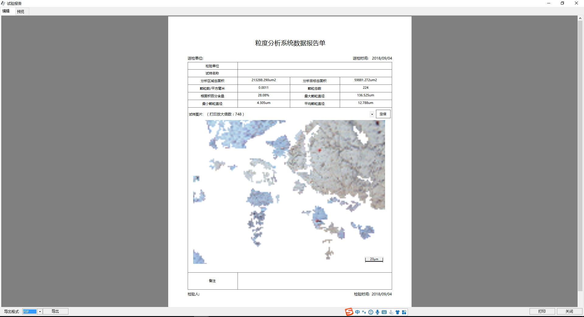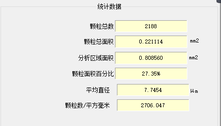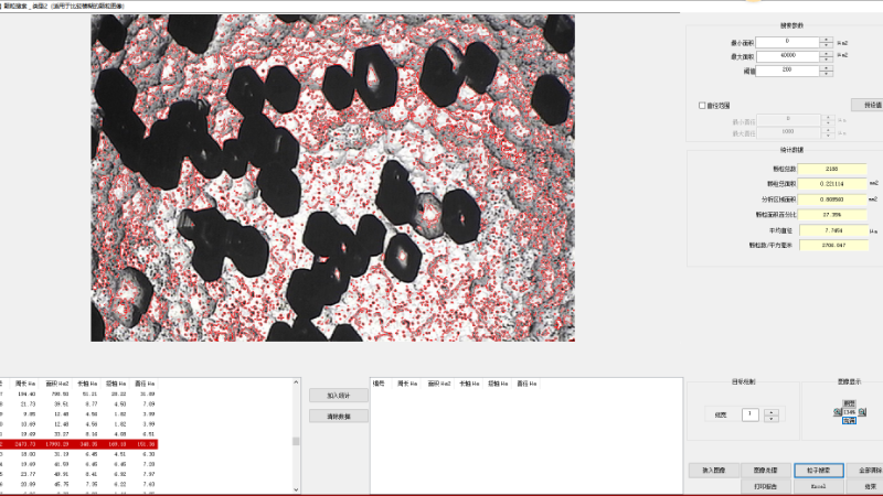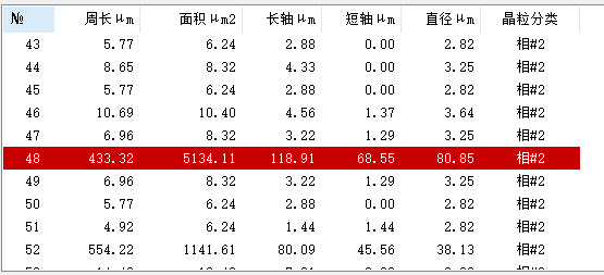 出每个颗粒的直径、周长、面积,以及所有颗粒的颗粒总数、相面积百分含量、最大颗粒直径、最小颗粒直径、平均颗粒直径等数据。