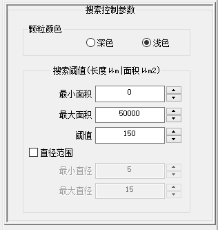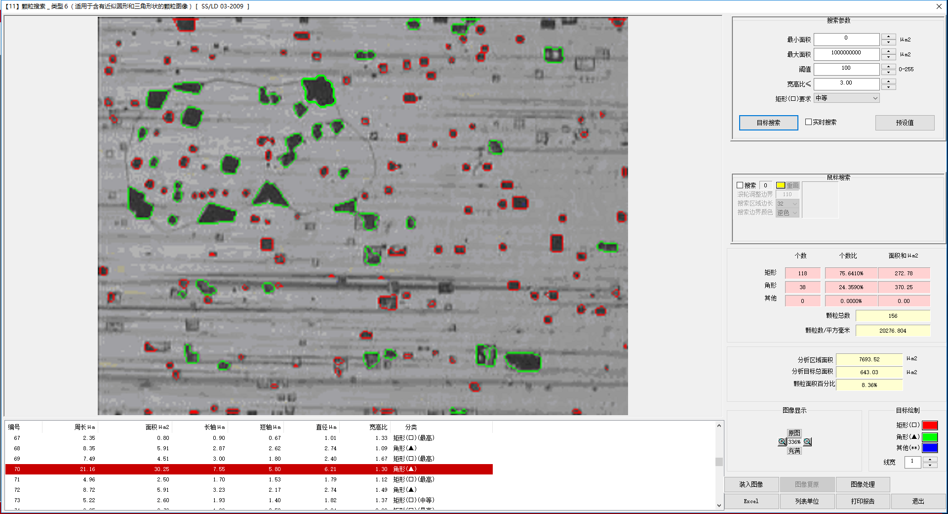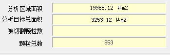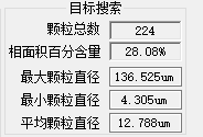 长轴、短轴、直径、形状比,统计出分析目标总面积、被切割颗粒数、颗粒总数。可先选区再搜索。