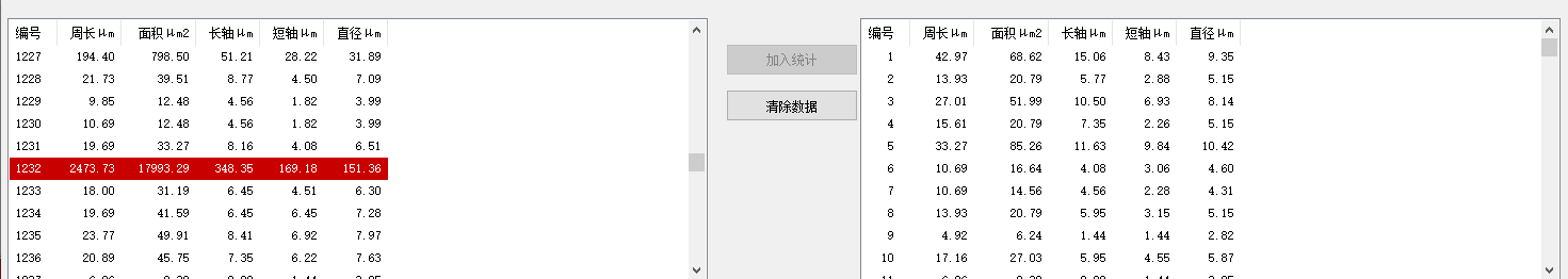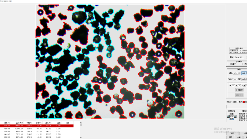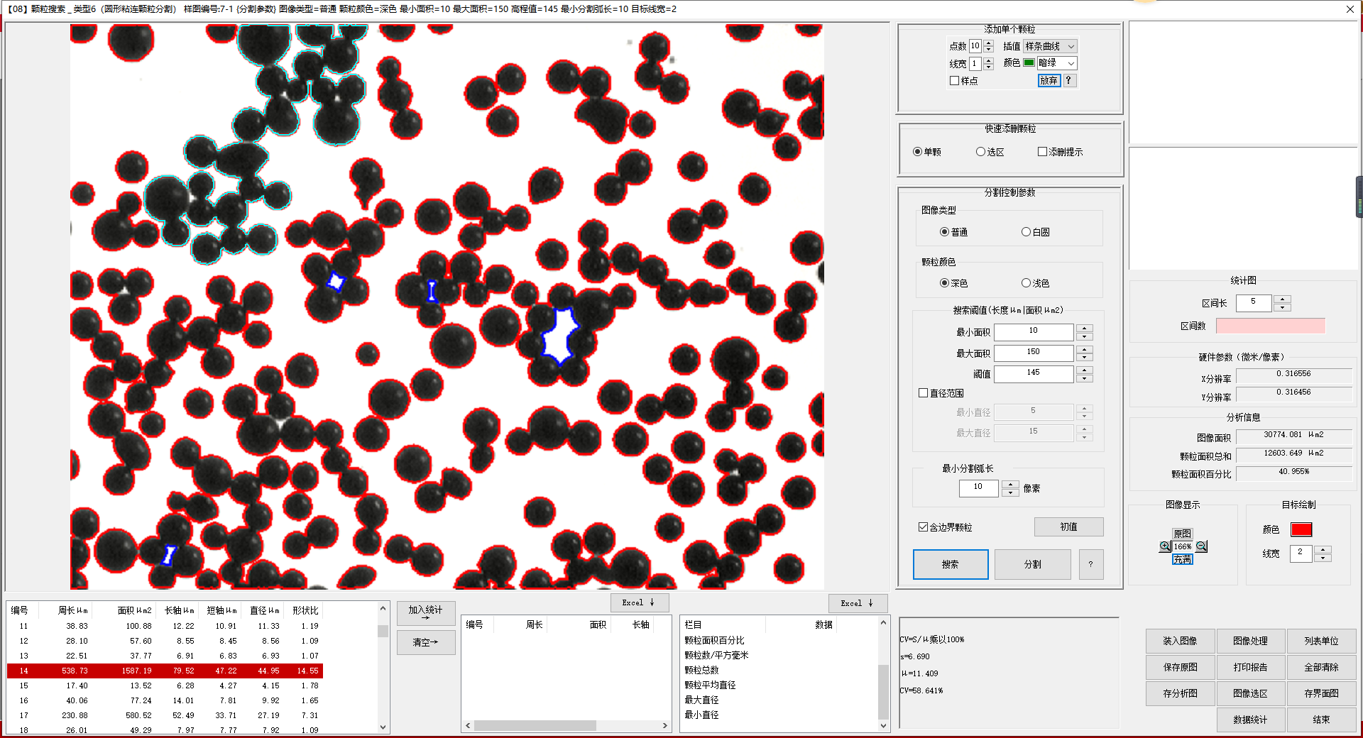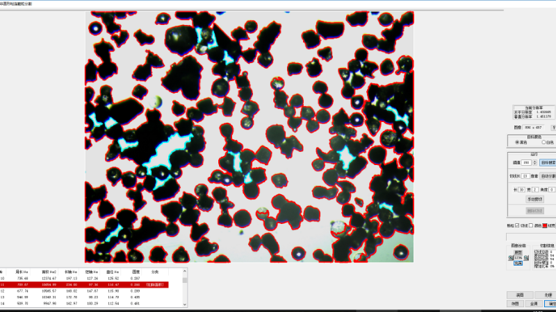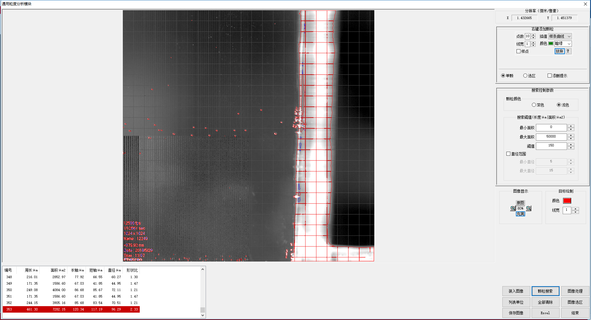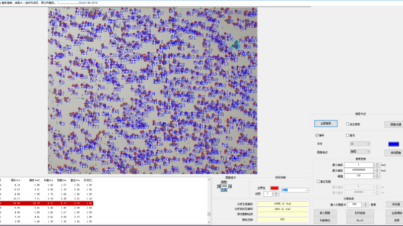 软件根据搜索参数,搜索出满足要求的颗粒,算出每个颗粒的周长、面积、