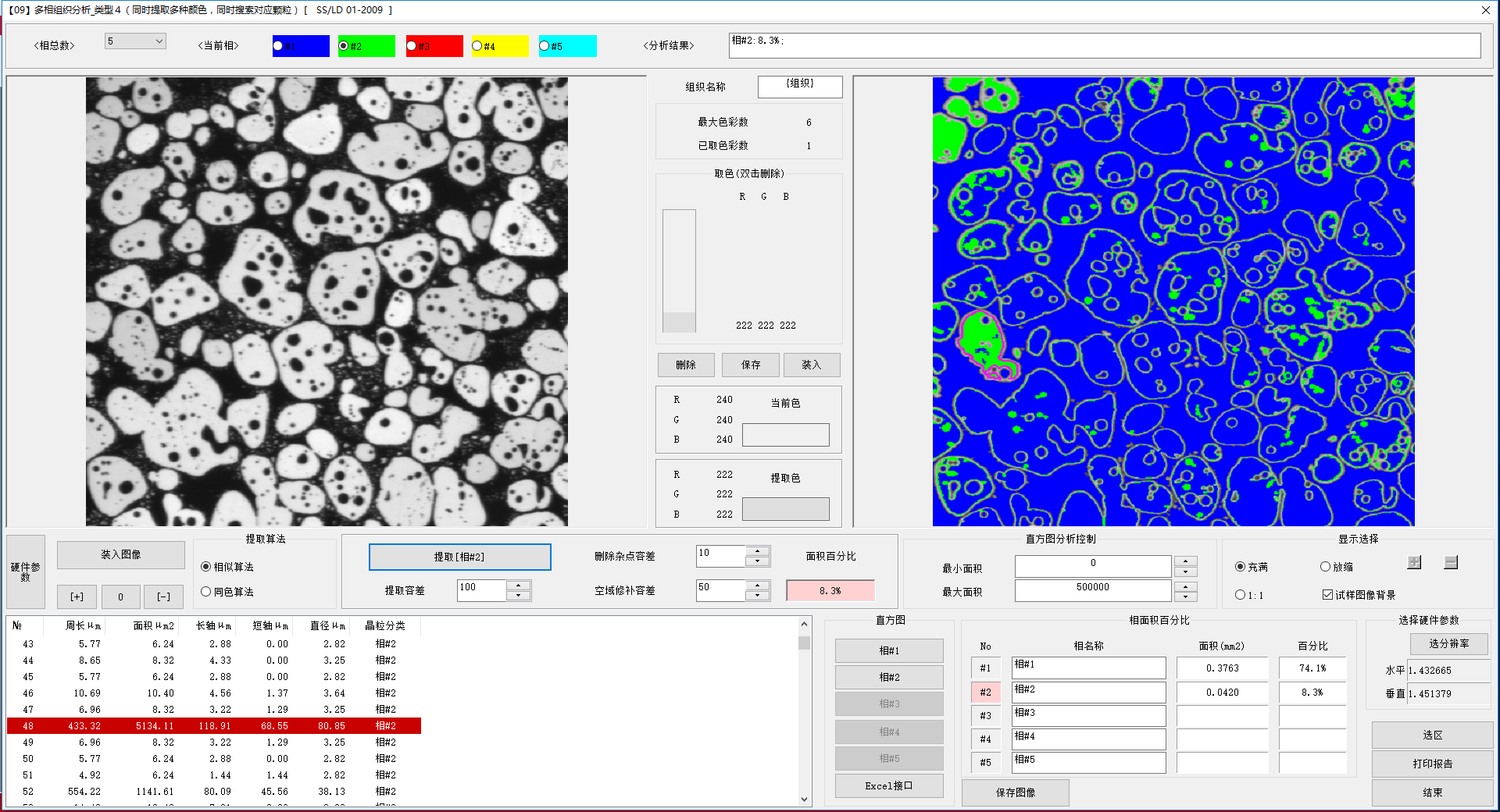 用鼠标提取5个不同组织的颜色,软件根据搜索参数,搜索出该组织每个颗粒的周长、面积、长轴、短轴、直径,自动算出该组织的面积和面积百分比。