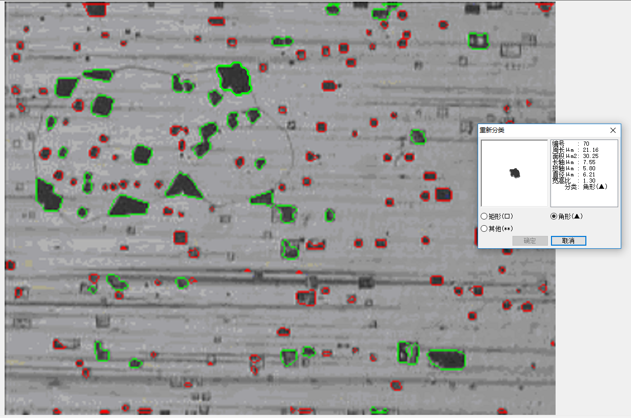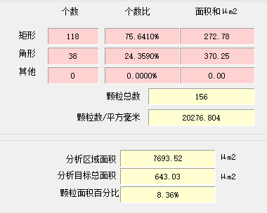 长轴、短轴、直径、宽高比、分类(矩形、角形或者是其他),统计出每种颗粒的个数、面积和,以及颗粒总数、颗粒数/平方毫米、颗粒总面积、颗粒面积百分比,并绘制统计图。可以用鼠标搜索工具添加颗粒,也可手工改变某个颗粒的属性。