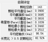l 用鼠标在图上选取需要分析颗粒的颜色,可以选择6种颜色,然后设置搜索参数,搜索出想要的颗粒,并算出颗粒百分比;同时算出颗粒总数、颗粒平均直径、平均截面积、平均截距、弗里特直径、最小直径、最大直径、平均短轴长,长宽比>0.5的颗粒比等数据。