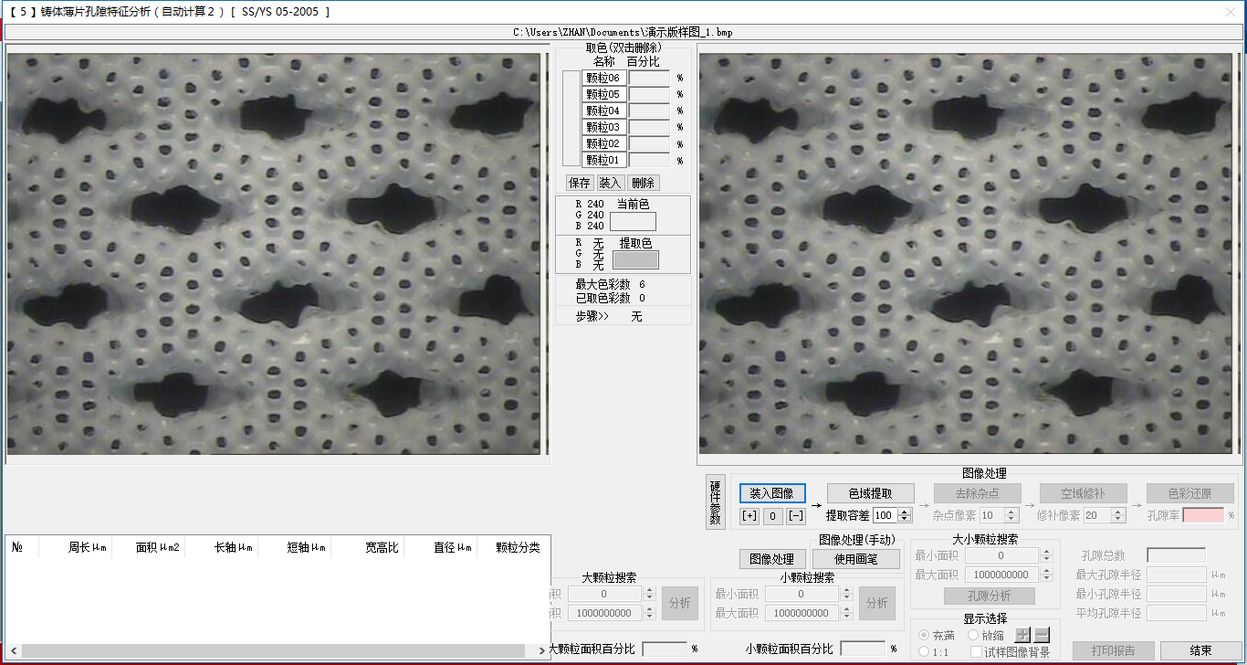 l 用鼠标拖动的方式,圈出孔隙部分,得到孔隙面积,软件自动算出孔隙率;可保存和载入测量过程。