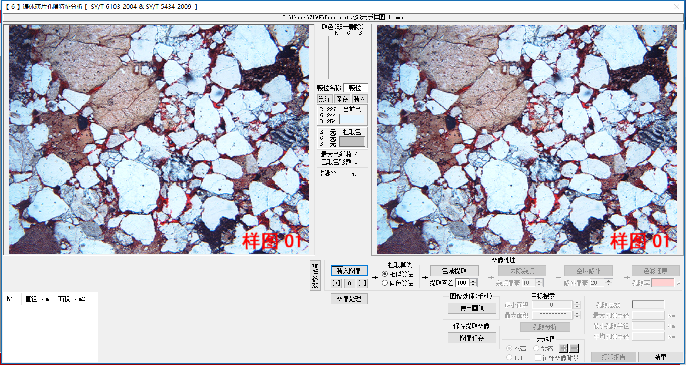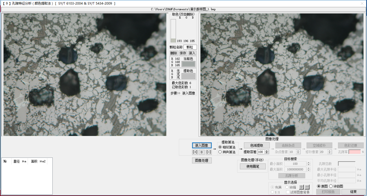 l 用鼠标在图上选取孔隙颜色,可以选择6种颜色,然后设置搜索参数,搜索出想要的孔隙,并算出孔隙率,同时算出孔隙总数、最大孔隙半径、最小孔隙半径、平均孔隙半径等值。