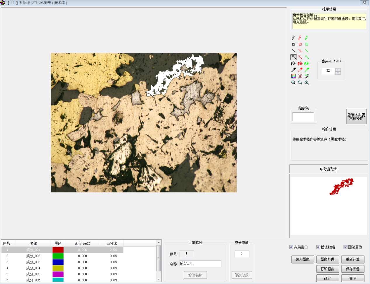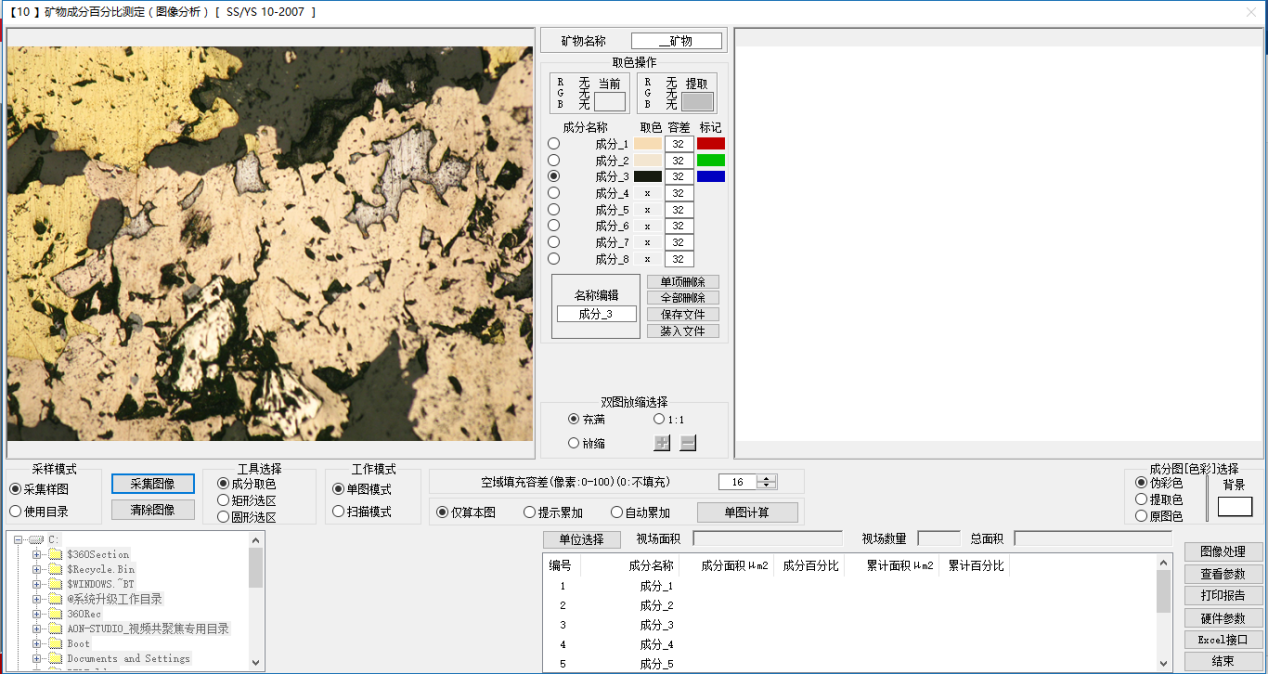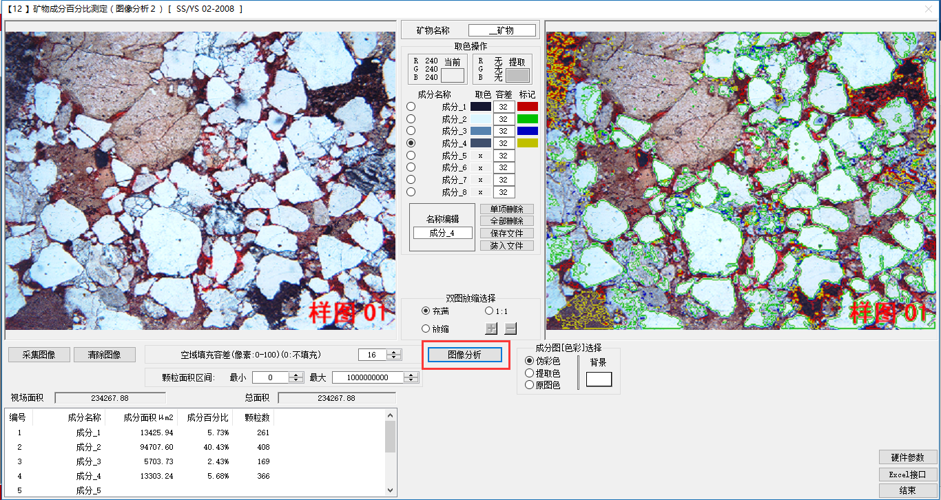 l 可用鼠标选择8种成分的颜色,并设置每种成分的容差,软件根据该数据,在图上搜索出对应的组织,并算出面积和面积百分比。