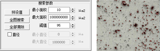 2、搜索参数设置:通过最小面积、最大面积、阈值的设置可以进行全图搜索,搜索出全图所设参数内的所有孔隙。