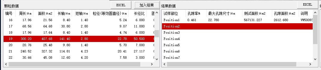 4、孔隙分析:可分析出每个孔隙的周长、面积、长轴、短轴、等效圆直径、长径比、圆形度等数据。