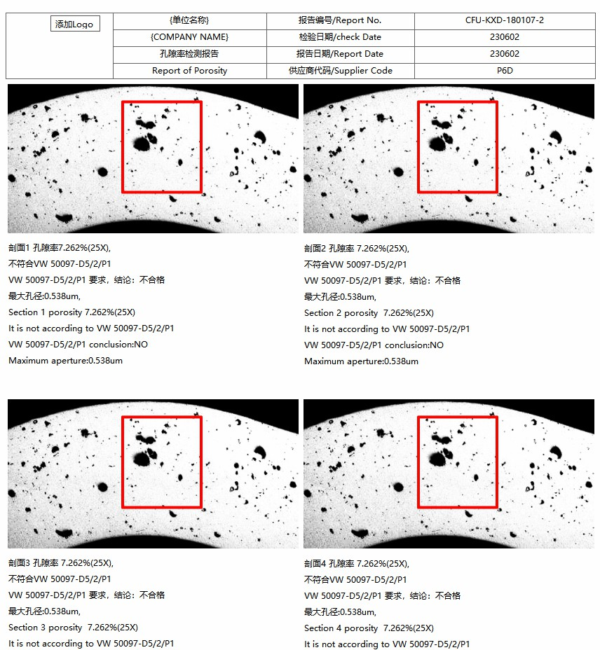 FKX2025孔隙率图像分析通过显微镜图像方法检测汽车零部件孔隙率,符合德国大众VW50097和PV6097标准的汽车行业用铸铝孔隙率测定系统,测量结果准确,可靠。主要用于分析铝合金和铸铁等铸件的铸造孔隙分析,同时也适用于其他材料的孔隙分析及金相分析。