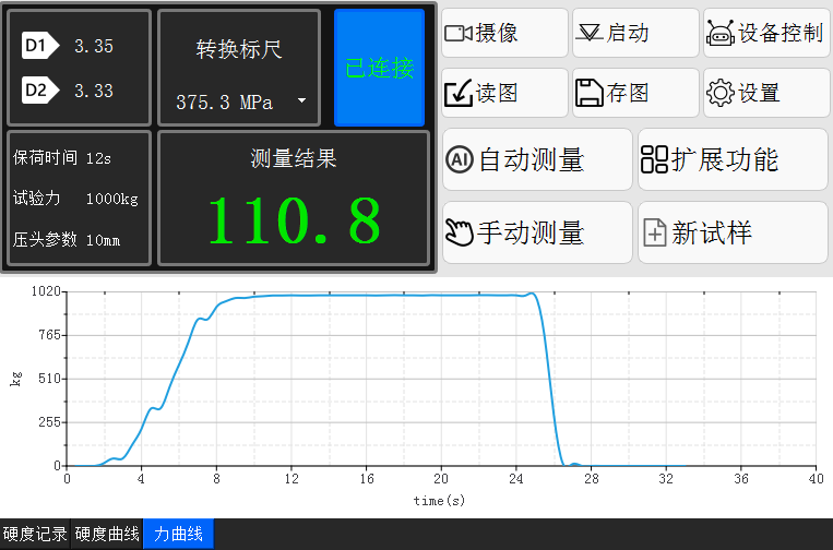 内置CCD图像自动测量系统, 操作界面模块化设计,可直观显示压痕直径,硬度值及硬度值曲线,转换标尺,检测时间以及图像等内容。 |